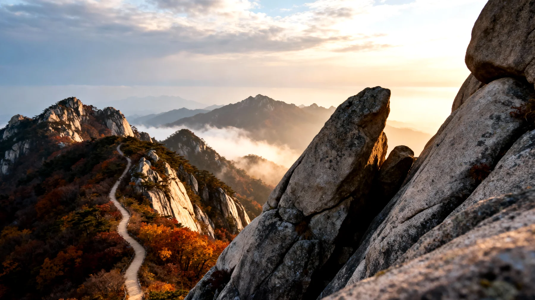 Pour les plus téméraires, l’ascension du rocher Ulsanbawi représente le défi phare du parc. Comptez environ deux heures pour gravir les 808 marches métalliques qui serpentent le long de cette formation rocheuse spectaculaire. En hiver, les chaînes de sécurité deviennent indispensables sur certains passages glacés, ajoutant une dose d’adrénaline à l’aventure. Au sommet, la récompense visuelle dépasse toutes les attentes : un panorama à 360 degrés sur les pics enneigés qui s’étendent jusqu’à la mer de l’Est. Prévoyez des crampons légers dans votre sac, un investissement d’environ 15-20 euros qui transformera votre expérience en toute sécurité.